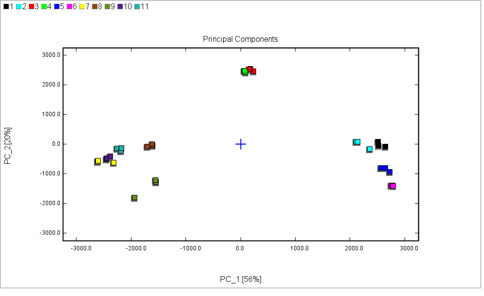 3、PCA分析图:动态主成分分析PCA,用于将样品聚类分析,比较样品相似度。