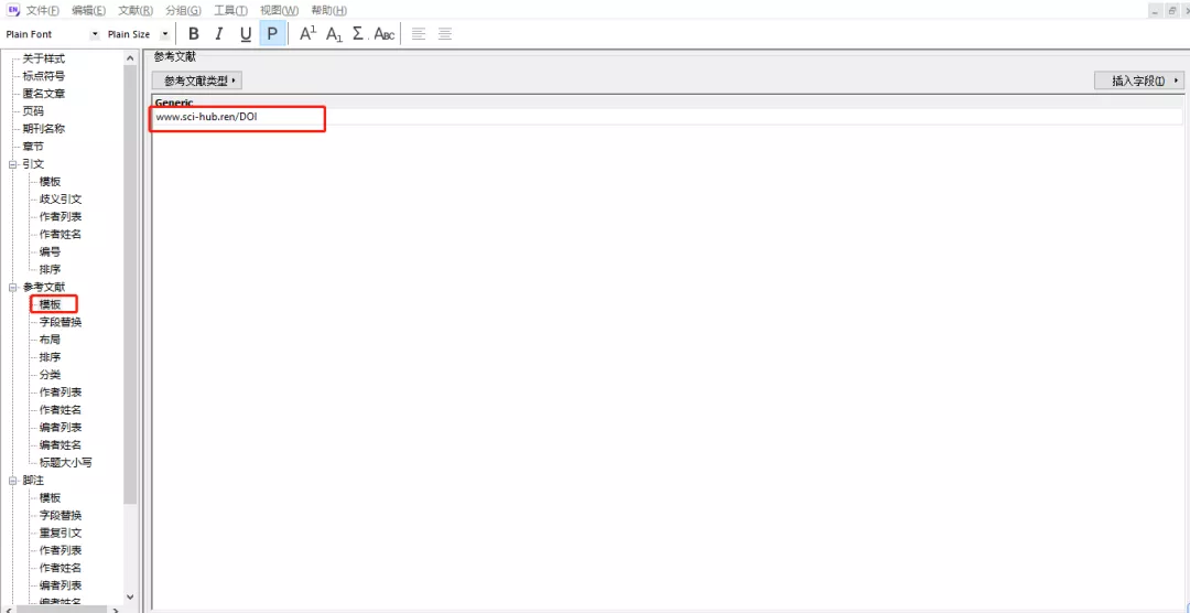 第二步:在参考文献样式管理页面找到:模板-参考文献类型,在里面输入www.sci-hub.ren/|DOI (可直接复制过去)即可。