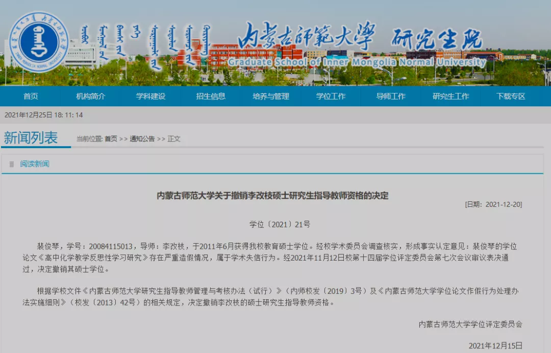 12月20日,内蒙古师范大学研究生院发布两则公告,因学位论文存在严重造假,严重抄袭的情况,决定撤销2人硕士学位,撤销这两名学生导师的研究生指导教师资格。2人分别于2011年、2013年获得硕士学位。
