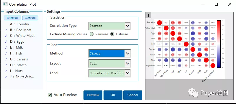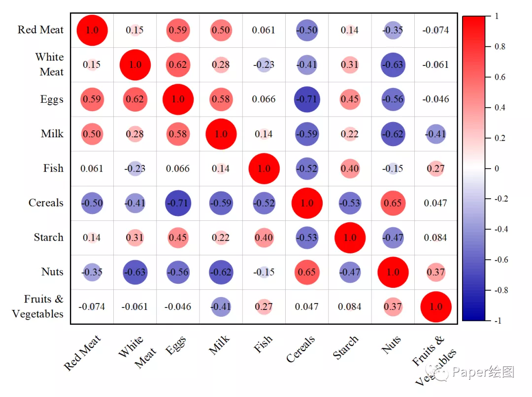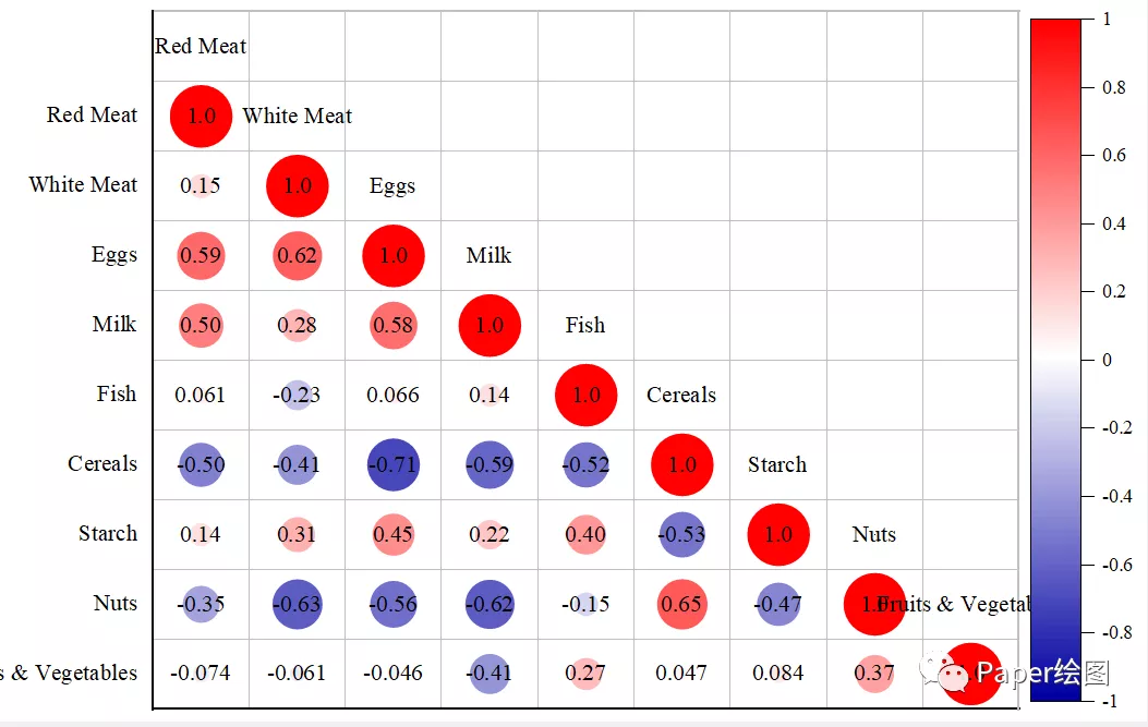 15. 选好相关参数,最终进行出图就可以了,红色表示正相关,蓝色表示负相关,圈越大相关系数绝对值越大。