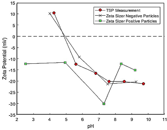 如图8所示,使用切向流电势和激光多普勒电泳评估了PTFE膜的Zeta电位。可以看到,PTFE膜在低pH范围内带正电,然后随着pH的增加而迅速变为负,等电点在pH 为5左右。在较高的pH值(7.5)下,膜的Zeta电位稳定在约-20 mV。该工作证实了激光多普勒电泳是通过确定膜表面Zeta电位来表征膜表面电荷的合适方法。与传统方法论相比,该技术具有多个优势,其将方法扩展到覆盖带正电的表面,这使该新技术能够跨越膜表面电荷表征所需的整个测量范围。