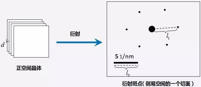 第一步虽然简单,但我们还是有必要详细说明一下晶面间距如何计算。现在我们手中只有一张衍射斑点图,图上有几个圆点,这些衍射斑点是晶体的倒易点阵。此外,还有一个标尺,标尺单位为1/nm(1/nm是倒空间的长度单位)。