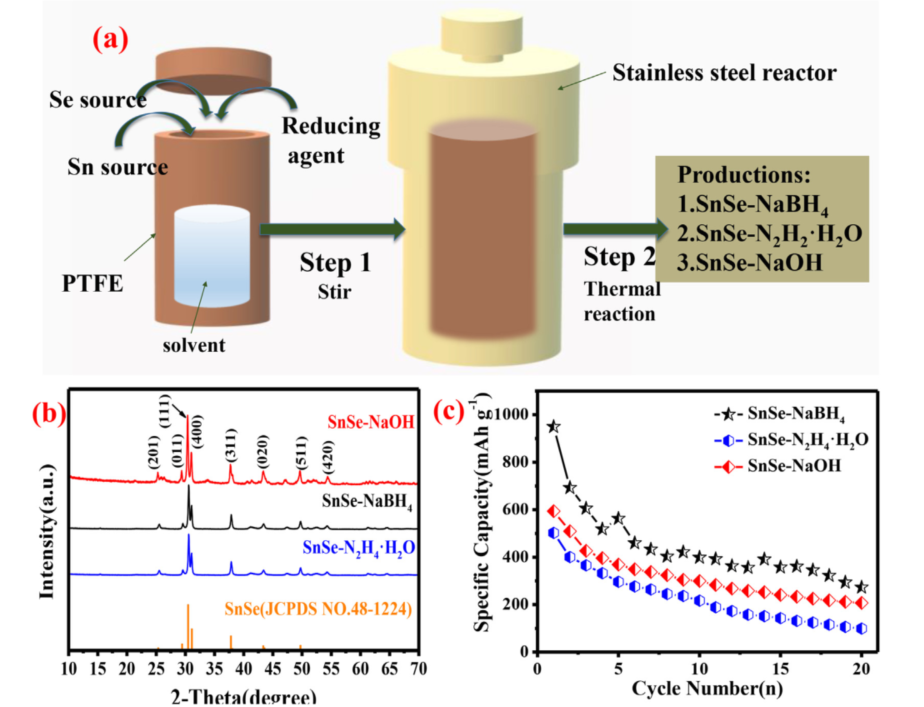 SnSe的合成图、(b)XRD和(c)SnSe-NaBH4、SnSe-N2H2·H2O、SnSe NaOH在0.2A g−1下的20次循环图像.png)