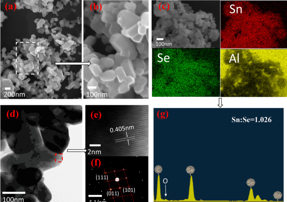 ,(b)SnSe-NaBH4的SEM,(c)映射;(d) 透射电镜;(e) HRTEM;(f) SnSe-NaBH4的SAED图像、(g)SnSe-NbBH4的EDS.png)