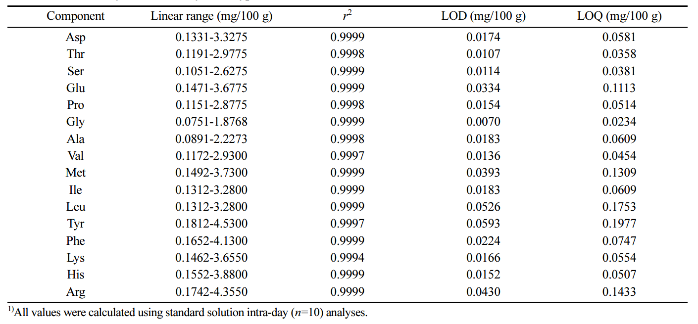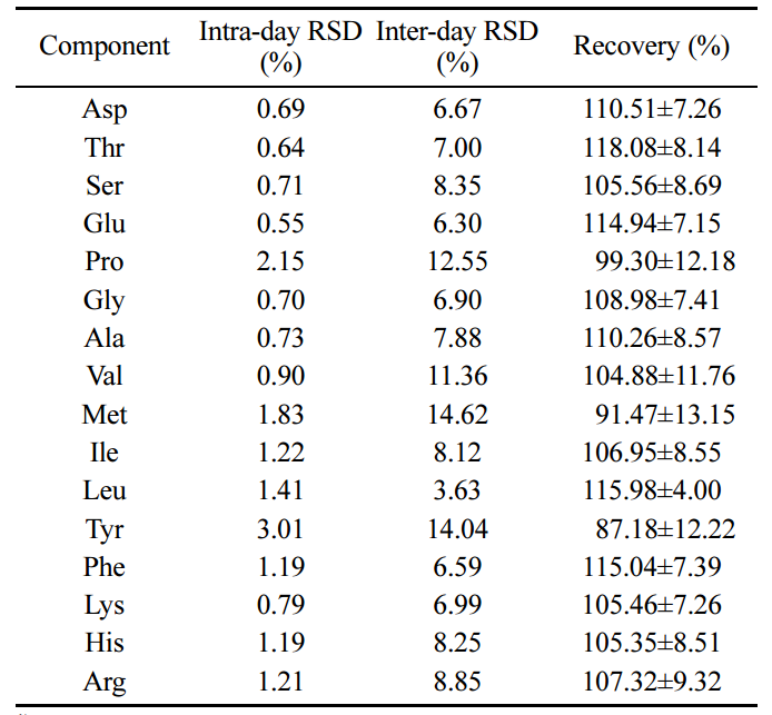 参考文献:1.Shim, Y.-S.; Yoon, W.-J.; Ha, J.; Seo, D.; Lee, K.-W.; Lee, W.-Y.; Kwon, K.-I.; Kang, T.-S.; Lee, J.-H.; Kim, H.-J.; Kwak, H.-J.; Lee, S.-P.; Kim, S.-J.; Yun, W.-K.; Lee, J.; Hwang, J.-B., Method validation of 16 types of structural amino acids using an automated amino acid analyzer. Food Sci. Biotechnol. 2013, 22 (6), 1567-1571.