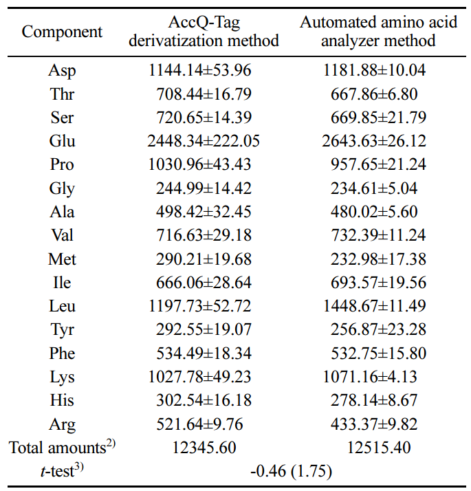 表3 AccQ-Tag柱前衍生法与全自动氨基酸分析仪结果的比较