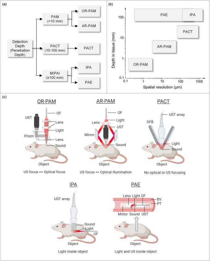 图1。光声成像实现。(a)基于探测深度的光声成像实现。PAI,光声成像; PAM,光声显微镜检查法; PACT,光声 X射线计算机断层成像; MIPAI,微创光声成像; OR-PAM,光学分辨率光声显微镜检查法; AR-PAM,声学分辨率光声显微镜检查法;。(b)光声成像(PAI)技术的空间分辨率与检查深度之间的关系。OR-PAM,光学分辨率光声显微镜检查法; AR-PAM,声学分辨率光声显微镜检查法; PACT,光声 X射线计算机断层成像; IPA,内照明光声; IPA,内照明光声; PAE,光声内窥镜。(c)具代表性的纤维光学光声成像实施方案。OR-PAM,光学分辨率光声显微镜检查法; AR-PAM,声学分辨率光声显微镜检查法; PACT,光声 X射线计算机断层成像; IPA,内照明光声; PAE,光声内窥镜; OF,光学纤维; UST,超声变换器; OFB,光学纤维束; BV,血管; PT,保护管。