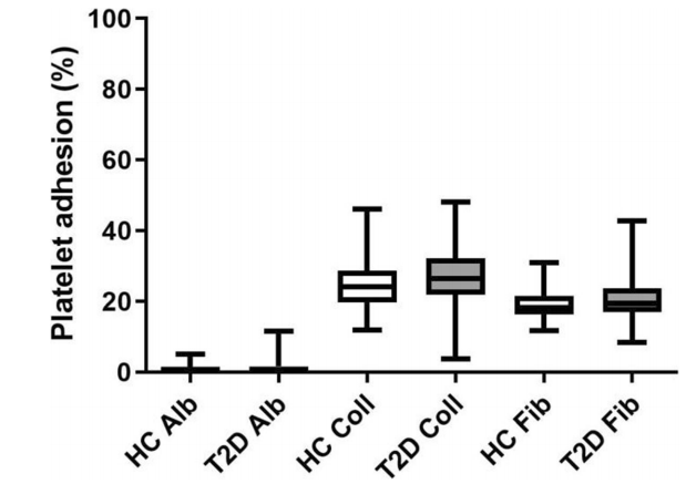 图1 在健康对照组(HC, n = 60)和2型糖尿病受试者(T2D, n = 60)中,胶原蛋白(Coll)和纤维蛋白原(Fib)表面引起的血小板粘附比白蛋白(Alb)明显更多,胶原蛋白表面引起的粘附比纤维蛋白原明显更多(p < 0.001,所有比较)。与对照组相比,T2D患者的粘附性无显著差异。方框显示第25到75个百分位数,胡须显示所有点的最小值到最大值。框中的中线表示中值