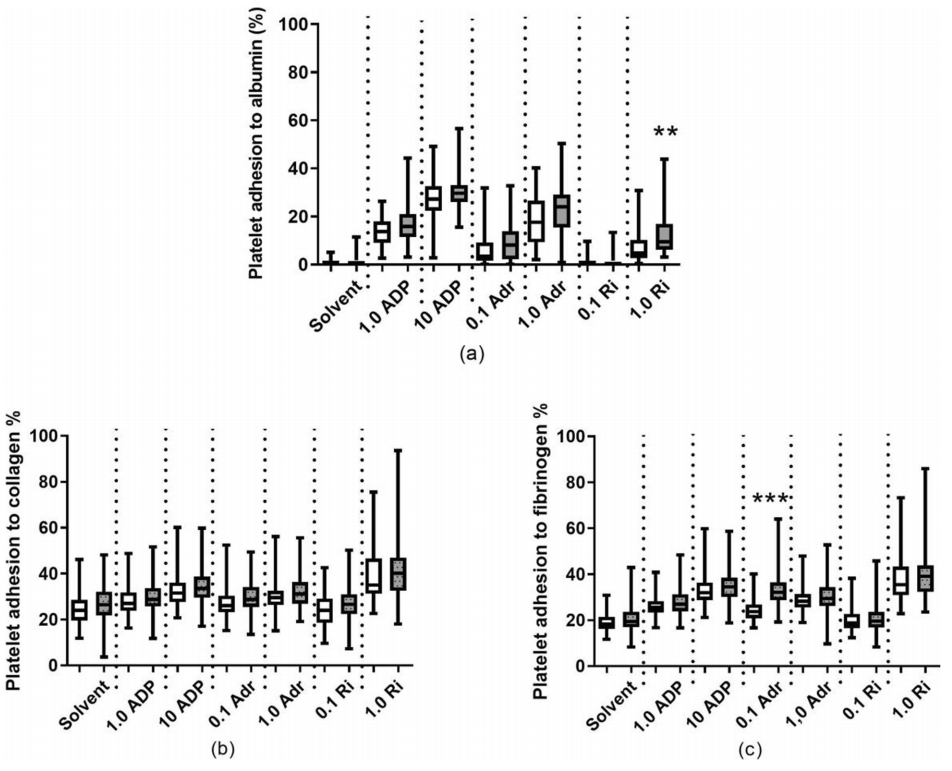 图2 健康对照(白色,n = 60)和2型糖尿病患者(灰色,n = 60)的血小板粘附(a)白蛋白;(b)胶原蛋白;(c) 1.0和10µmol/L二磷酸腺苷(ADP)激活后的纤维蛋白原;肾上腺素(Adr) 0.1、1.0µmol/L;或0.1和1.0 mg/mL瑞斯托素(Ri)。溶剂是指在没有任何可溶性活化剂的情况下与蛋白质表面的基础粘附。方框显示第25到75个百分位数,胡须显示所有点的最小值到最大值。框中的中线表示中值。2型糖尿病患者与健康对照**p < 0.01, **p < 0.001