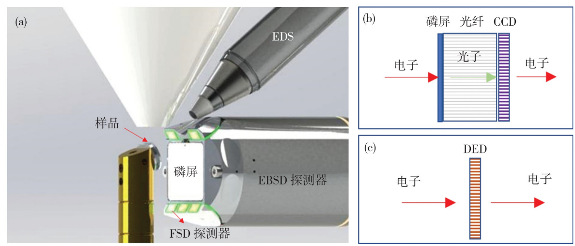图1. EBSD探测器的位置(a)和信号转换传统方式(b),直接电子探测方式(c)[1]