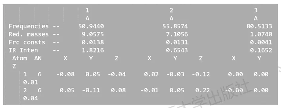 通过观察频率计算的输出文件,可以找到各组振动模式的信息。以第四章讨论过的NHC-Ag配合物为例,在频率计算的输出文件中列出了各组振动模式的频率、有效质量、力常数、红外强度等,随后是各振动模式中原子的位移向量(图5.1)。