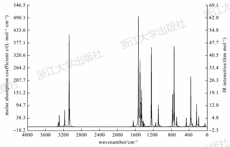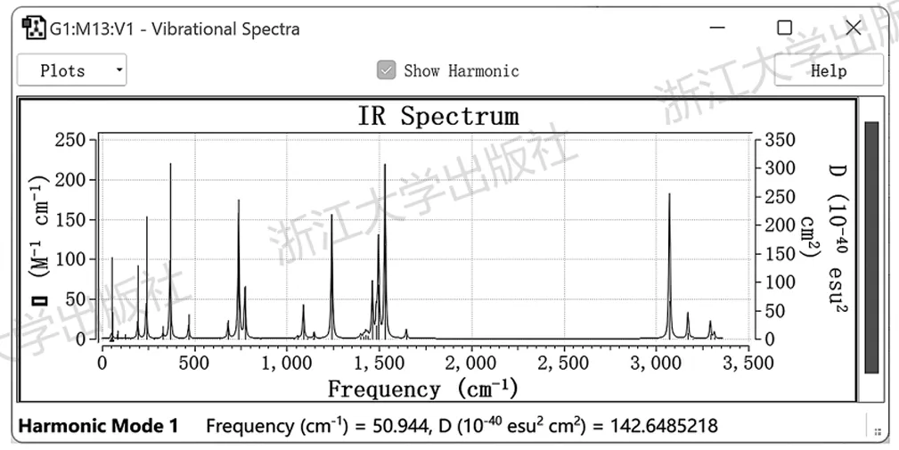 由此可以知道,这个频率为50.94cm⁻¹的振动模式对应于骨架的弯曲振动。用类似的方式,可以对各振动模式进行归属。点击Spectra按钮,可以显示红外光谱,其中各谱峰位置与振动波数一一对应,如图5.3所示。