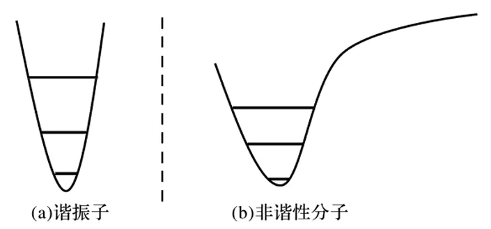 在之前的讨论中,将各振动模式均认为服从谐振子模型。根据这一模型,随着偏离平衡位置的距离增大,能量以二次函数的形式上升至正无穷,而分子中显然不满足这一规律。随着结构偏离平衡位置,能量应逐渐过渡到平缓。这使得分子的能量-位置曲线呈现出如图5.4(b)所示的形状。