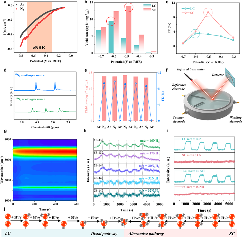 图3:氨产率和FE随电位变化呈现出“火山图”趋势,其中SC在-0.5V时展现出远超LC的优异性能。ATR – SEIRAS和DEMS分别从光谱和质谱的角度,直观地展示了反应过程中物质的变化情况以及反应途径,为理论预测的反应路径差异提供了有力的实验验证。