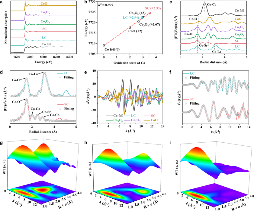 图4:为LC和SC为基于同步辐射的X射线吸收谱。通过归一化的Co K边XANES光谱及氧化态计算,准确得出LC和SC中Co的氧化态分别为+2.94 和+3.53。FT-EXAFS光谱在R空间和k空间的分析,揭示了Co的局部配位环境,包括Co-O、Co-La、Co-Sr 键的特征以及配位数的差异。这些结果充分表明,A位金属元素的替代对Co的配位环境产生了显著影响,而这种配位环境的变化与催化剂性能之间存在着紧密的联系。