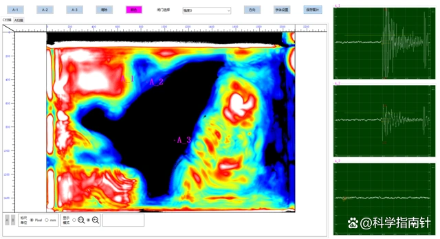 对局部区域(如A1、A2、A3点)分析,A3点超声信号无法穿透,浸润性欠佳;A1点能穿透,浸润较好;A2点处于中间状态。