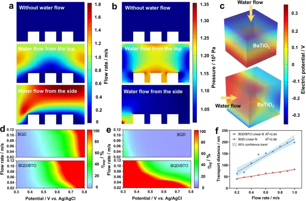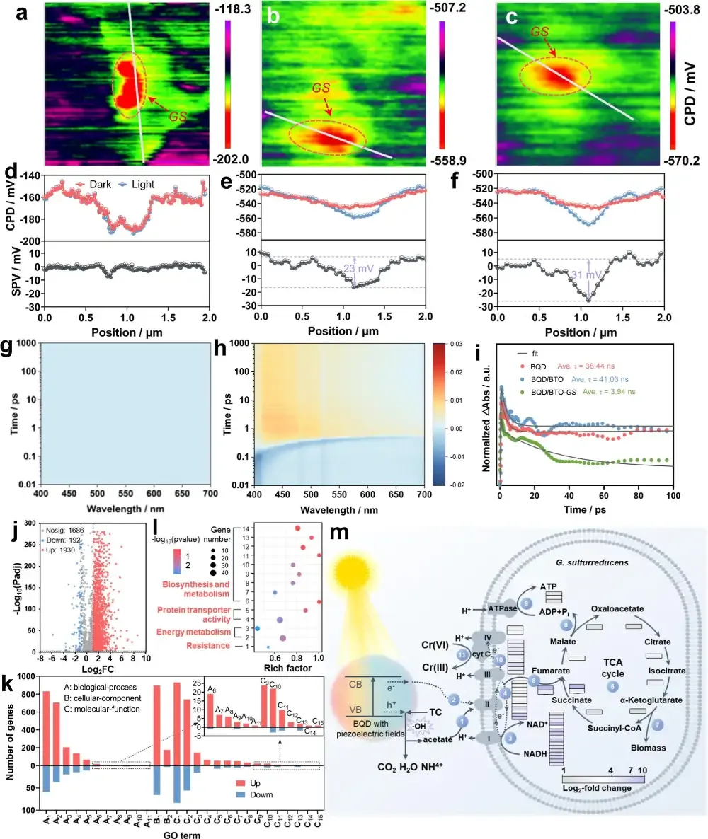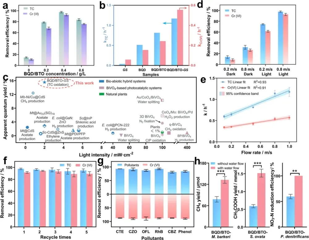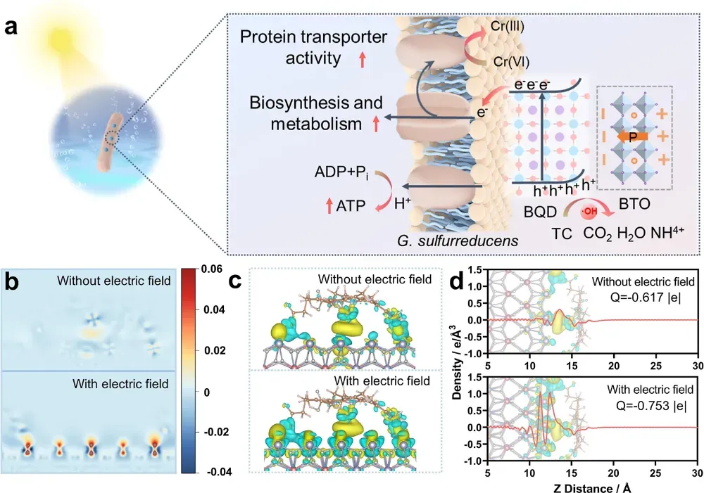 研究团队设计并构建了BQD/BTO-GS纳米-生物杂化系统。水流机械能极化BTO形成内置电场,驱动光电子从BQD转移到微生物,参与生物合成和重金属还原解毒。