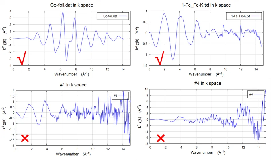 通常,我们可以通过观察K空间谱图进行初步判断。理想的K空间信号应呈现近似三角函数的形态,具有上下对称的振荡特征,如下方左图所示。然而,在实际测试过程中,样品数据往往难以达到标样那样线性光滑的理想状态。此时,可重点关注K空间横坐标的取值区间。一般来说,数据质量较高时,横坐标取值可达10以上,如下图的图左标样所示,其全区间数据均较为理想。但实际一般能取到6-8就能分析,如果6都取不到那数据质量就比较差了。(横坐标的取值范围直接影响R空间的拟合效果,取值越大,R空间中可分析的信息就越丰富)。