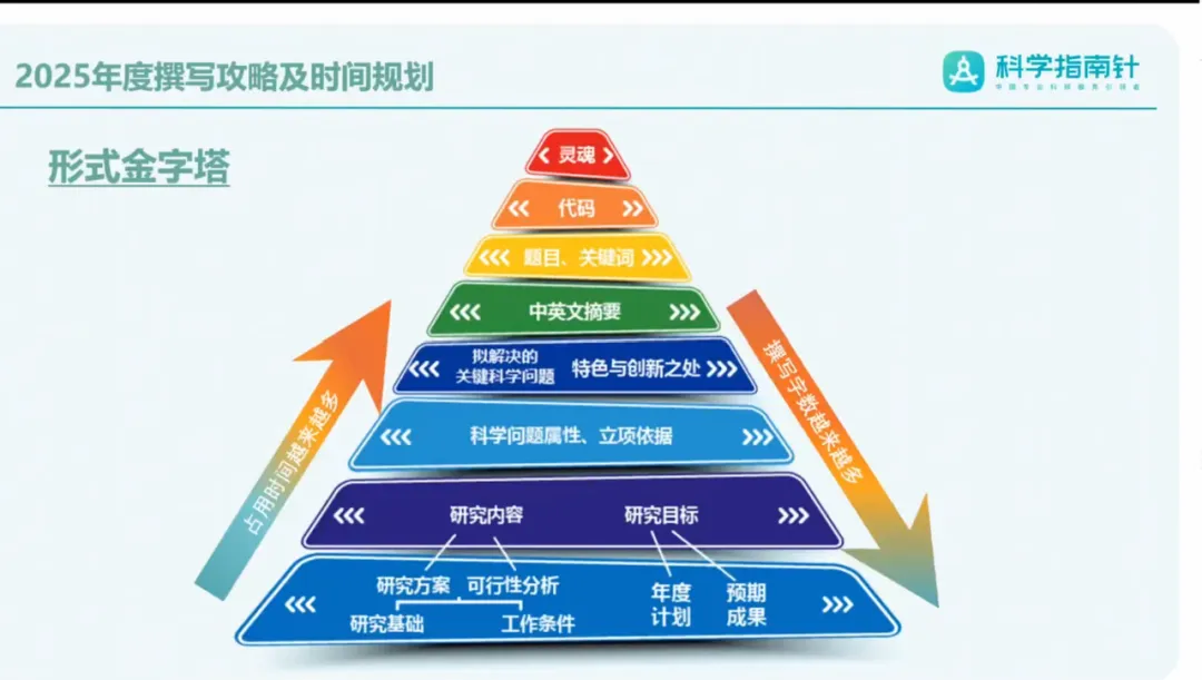 透过"形式金字塔"模型可以看出,从题目到立项依据,所有部分都围绕一个核心——科学问题。一个典型的国自然题目是一个名词性短语,其语法结构通常为:定语(背景/方法/对象)+核心名词(科学问题)。