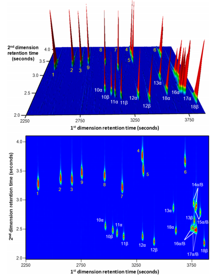 图2 含有苯乙酮1 - 9和还原外消旋产物10 - 18的混合物的chiral-GC×GC-TOF色谱图的两个不同投影,显示为“山形图”(上)和平面图(下)。