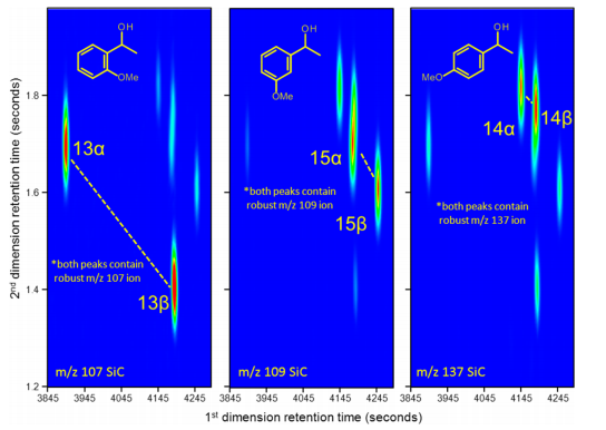 图3 选择离子chiral-GC×GC-TOF色谱图(SiC)显示基于质谱的邻位、间位和对甲氧基还原苯乙酮醇异构体的分化。