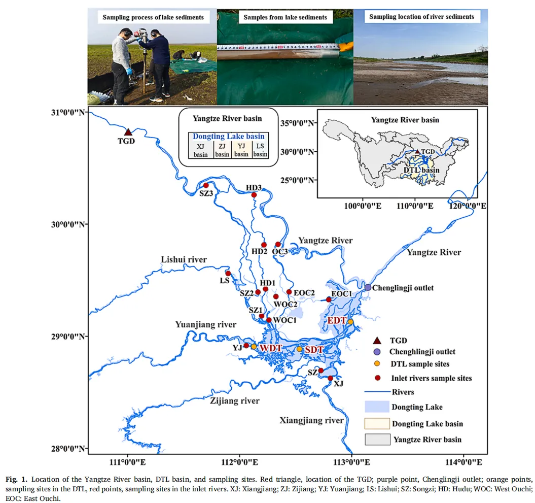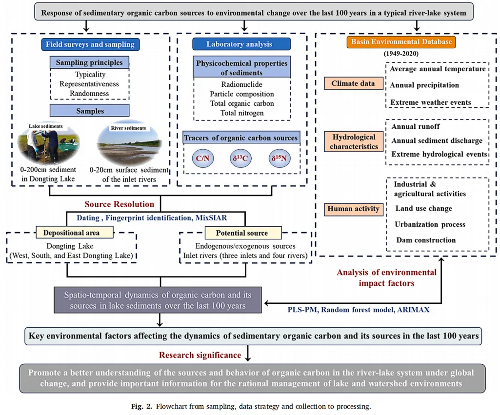 研究团队采用多学科交叉方法,整合稳定同位素指纹技术(δ¹³C和δ¹⁵N)、贝叶斯混合模型(MixSIAR)、偏最小二乘路径模型(PLS-PM)等先进技术,构建了百年尺度的沉积有机碳溯源体系。研究区域覆盖洞庭湖全流域,设置了具有代表性的采样网络: