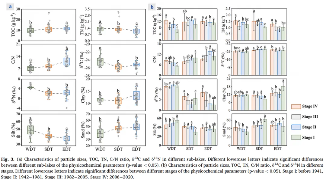 Fig. 3:不同子湖/阶段沉积物理化指标特征:粒度、总有机碳(TOC)、总氮(TN)、碳氮比(C/N)、CN同位素