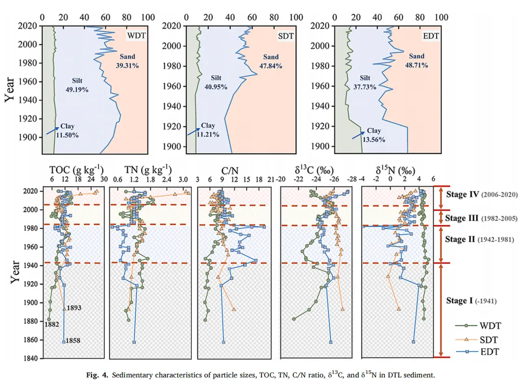 Fig. 4:洞庭湖沉积物中颗粒粒径、总有机碳(TOC)、总氮(TN)、碳氮比(C/N)、碳和氮稳定同位素的沉积特征
