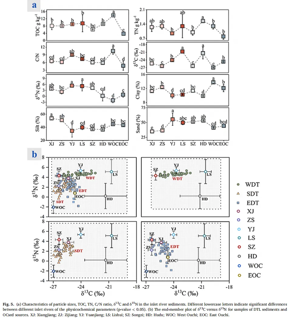 Fig. 5:(a) 入湖河流沉积物理化指标特征:粒度、总有机碳(TOC)、总氮(TN)、碳氮比(C/N)、同位素比值。 (b) 洞庭湖(DTL)沉积物样品与沉积有机碳(OCsed)来源的同位素值端元图。