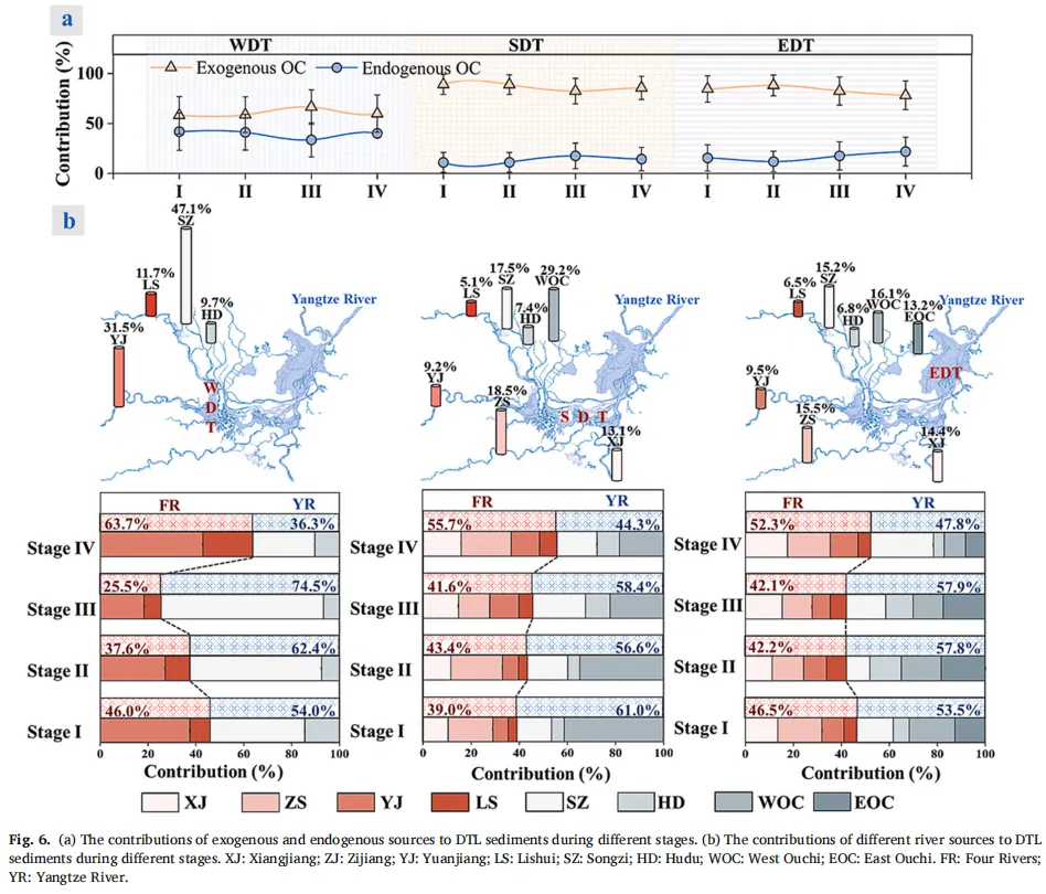 Fig.6:(a)洞庭湖沉积物有机碳外源与内源贡献及不同入湖河流来源贡献(分阶段)。(b)不同阶段各入湖河流来源对洞庭湖(DTL)沉积物的贡献比例。