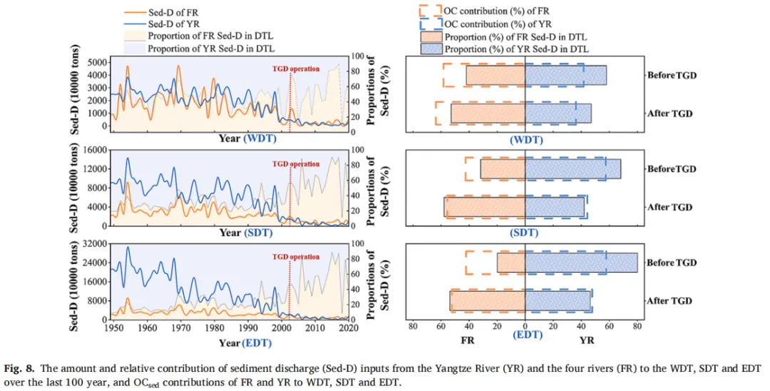 Fig.8:近百年来长江(YR)与四条支流(FR)向西洞庭湖(WDT)、南洞庭湖(SDT)和东洞庭湖(EDT)输入泥沙通量及其相对贡献,以及FR和YR对三湖区沉积有机碳(OCsed)贡献