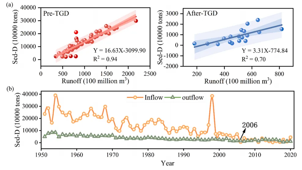 Fig.9:三峡大坝前后洞庭湖径流量与泥沙通量关系;以及洞庭湖泥沙输入输出量的年度变化