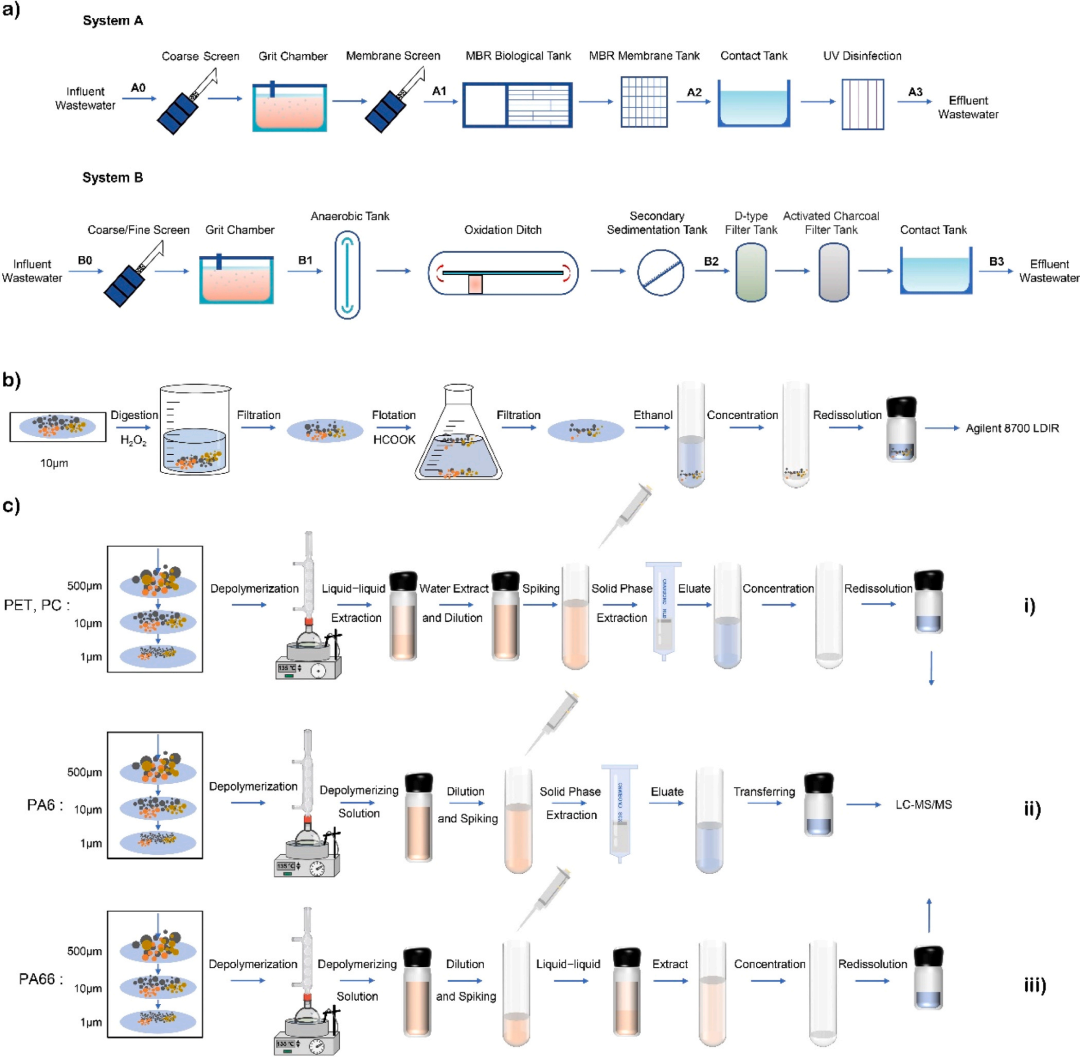 Fig.1:污水处理厂处理系统流程及采样点示意图(a),用于LDIR分析的废水样品预处理流程(b),用于LC-MS/MS分析的废水样品预处理流程(c)