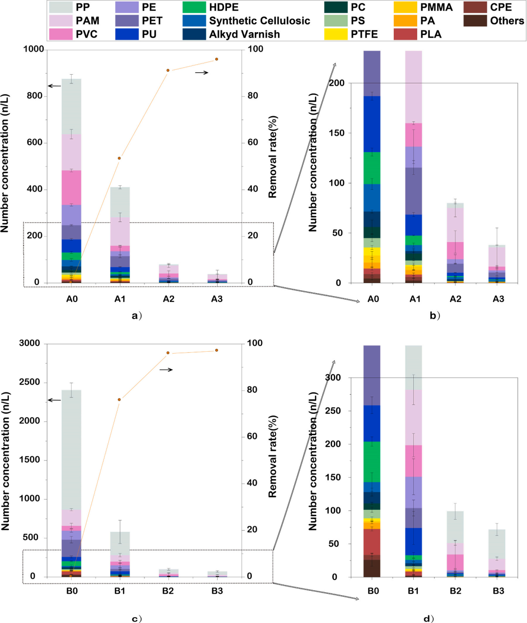 Fig. 2:通过 LDIR 分析得到的污水处理系统 A (a) 和 B (c) 中总微塑料的数量浓度(柱状图)与去除率(折线图)(n = 3),(b) 和 (d) 分别是 (a) 和 (c) 图中微塑料数量浓度的局部放大图(n = 3)