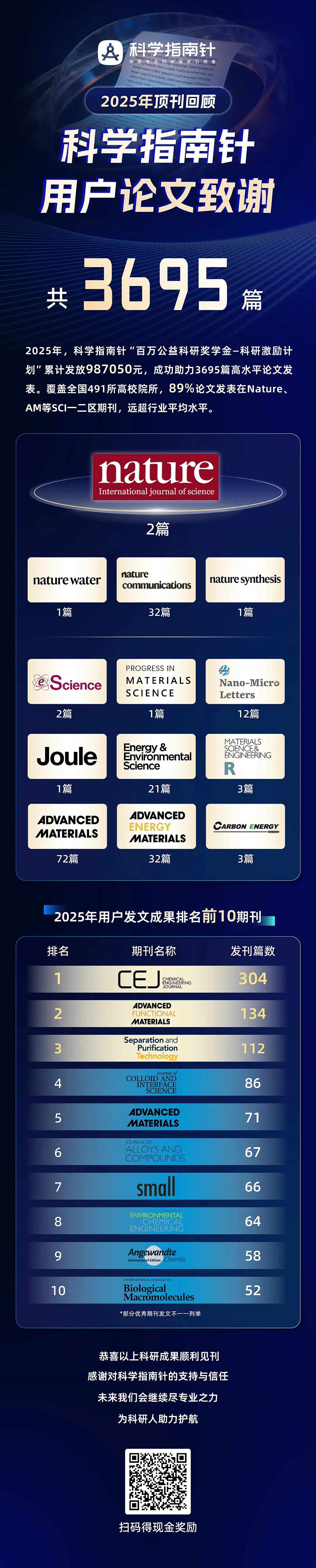 【摘要】 科学指南针科研服务平台成果卓著,已助力用户发表包括Nature、Advanced Materials在内的顶级期刊论文,并获得3695篇论文致谢。2024年1-3月即有865名用户在顶刊中致谢我们。立即扫描二维码,领取新用户专属福利,享受首样免200元优惠,助力您的科研突破!
