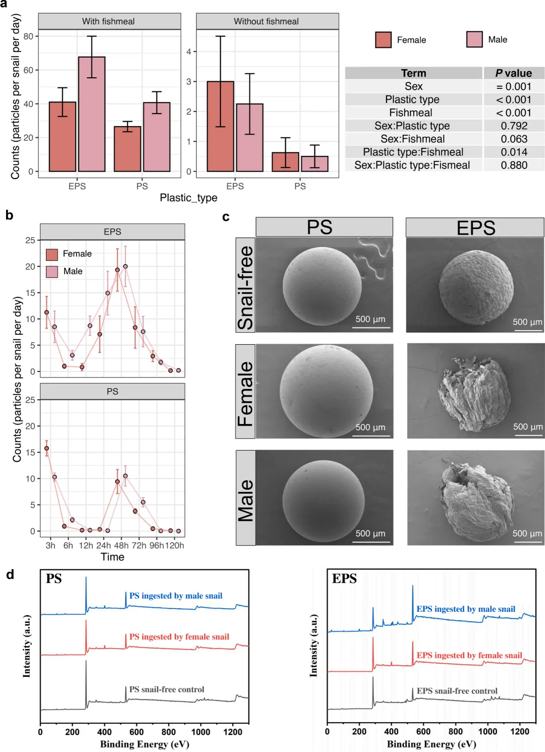 Figure 1:福寿螺对微塑料的摄入及由此导致的塑料表面性质变化。(a) 雄性和雌性福寿螺对PS和EPS微塑料的摄食偏好 (n = 10)。(b) PS和EPS微塑料在雄性和雌性福寿螺体内的滞留时间 (n = 4)。(c) 福寿螺消化后微塑料表面微形貌的变化。(d) 福寿螺消化后微塑料表面的化学修饰。