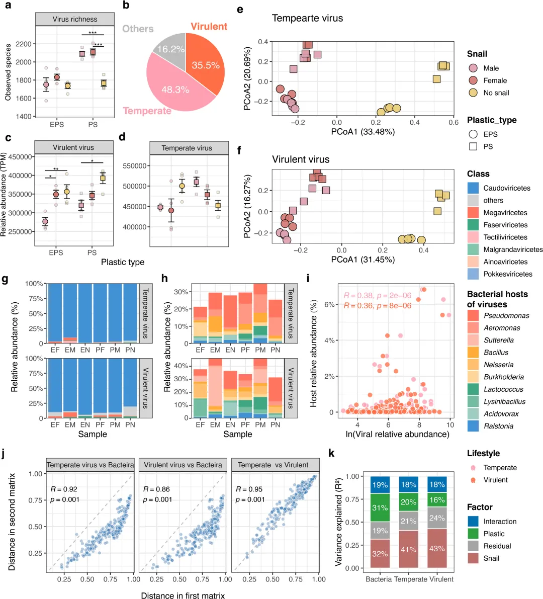 Figure 2:福寿螺消化对PS和EPS塑料圈病毒群落的影响。(a) 雄性和雌性福寿螺消化对PS和EPS塑料圈病毒丰富度的影响 (n = 4)。(b) 塑料圈中温和型和烈性型病毒的平均相对丰度。(c, d) 福寿螺消化对塑料圈中 (c) 烈性型和 (d) 温和型病毒相对丰度的影响 (n = 4)。(e, f) 基于 (e) 温和型和 (f) 烈性型病毒群落Bray-Curtis距离的主坐标分析排序图。(g) 塑料圈病毒群落的分类学组成(纲水平)。(h) 塑料圈病毒预测宿主属的相对丰度。(i) 病毒与其预测宿主属丰度之间的Spearman相关性。(j) 病毒与细菌群落以及不同类型病毒群落之间的Mantel检验相关性网络 (n = 24)。(k) 基于PERMANOVA分析,福寿螺消化和塑料类型对细菌、温和型病毒及烈性型病毒群落变异的解释率。