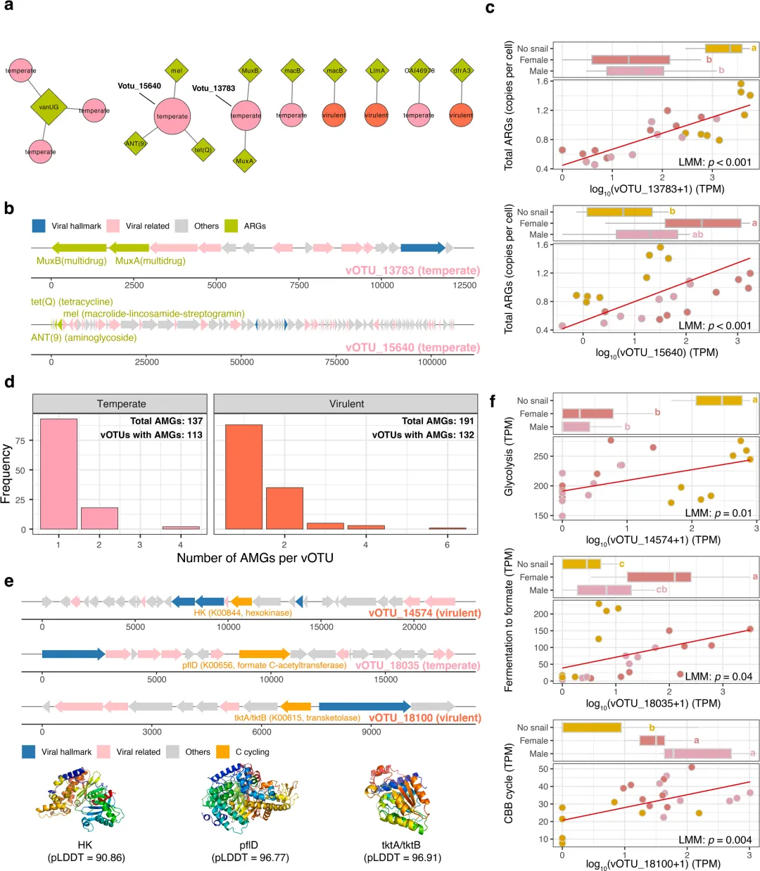 Figure 3:塑料圈病毒携带的ARGs和AMGs特征。(a) 温和型和烈性型病毒携带的ARGs网络图。(b) 携带多个ARGs的vOTUs基因组图谱。(c) 携带多个ARGs的vOTUs相对丰度与塑料圈ARGs总相对丰度之间的相关性 (n = 24)。(d) 温和型和烈性型病毒中AMGs数量的分布。(e) 携带碳循环相关基因的vOTUs基因组图谱。(f) 携带碳循环相关基因的vOTUs相对丰度与塑料圈碳循环通路之间的相关性 (n = 24)。