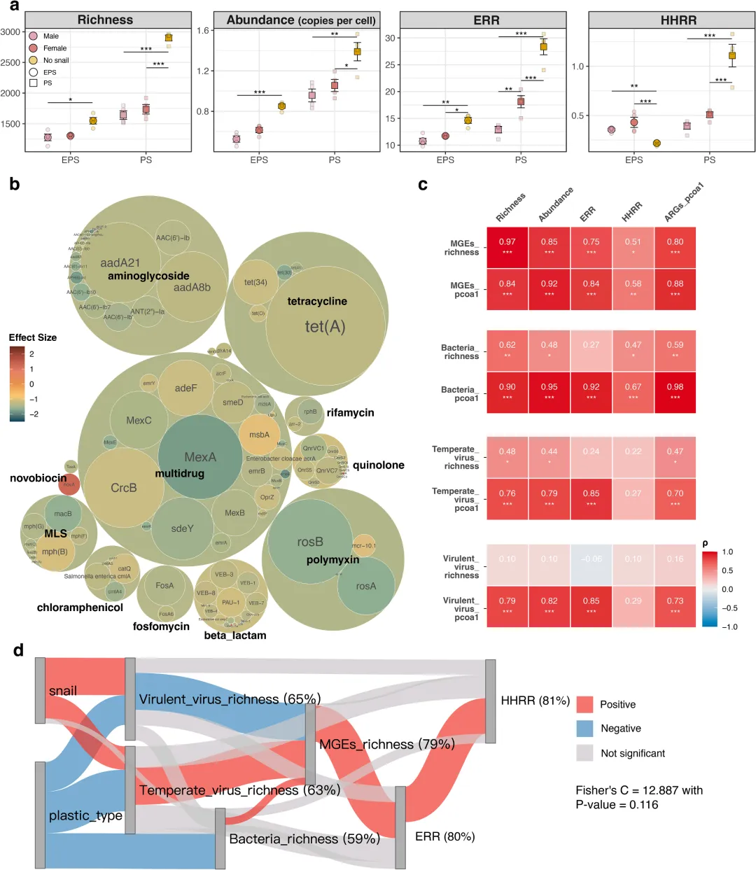 Figure 4:福寿螺消化对PS和EPS塑料圈风险的影响。(a) 雌性和雄性福寿螺对塑料圈ARG丰富度、ARG相对丰度、ERR和HHRR的影响 (n = 4)。(b) 基于LMMs(经 p < 0.001 过滤)展示差异ARG亚型和类型的环形树状图。效应量 > 0 表示在经福寿螺消化的微塑料中富集,效应量 < 0 表示在未经福寿螺消化的微塑料中富集 (n = 16 有螺;n = 8 无螺)。(c) 展示MGEs、细菌和病毒的丰富度及其群落结构(PCoA1得分)与ARG丰富度、丰度、风险指数及其群落结构(PCoA1得分)之间关系的相关性热图 (n = 24)。(d) 量化塑料圈ERR和HHRR直接和间接驱动因素的结构方程模型 (n = 24)。