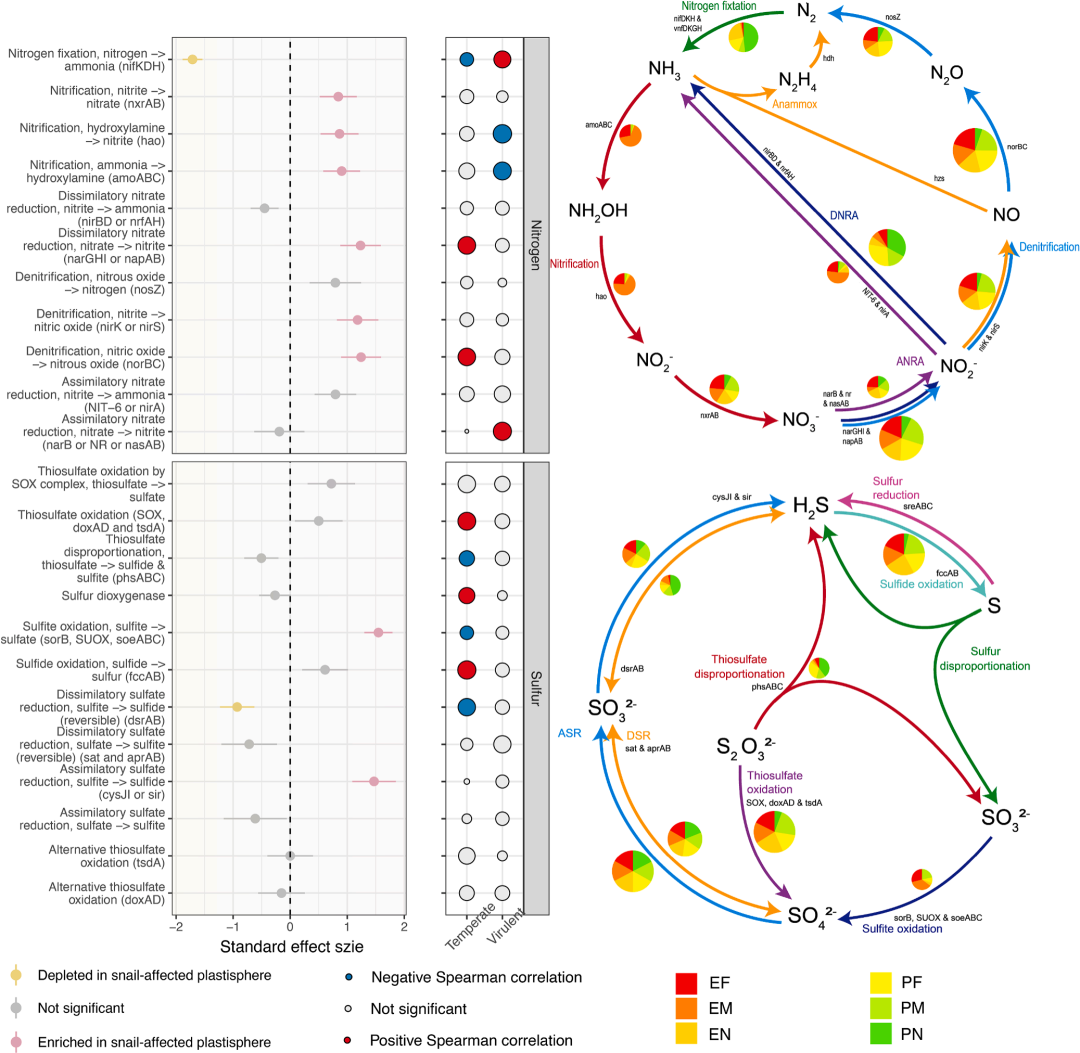 Figure 5:福寿螺消化对PS和EPS塑料圈氮循环和硫循环的影响。左侧: 显示标准化效应量(误差棒表示标准误)的条形图,数据来自LMMs。效应量 > 0 表示在经螺消化的塑料圈中相对丰度更高,效应量 < 0 表示在无螺对照中相对丰度更高 (n = 16 有螺;n = 8 无螺)。中部: 表示温和型/烈性型病毒与塑料圈氮/硫循环通路之间相关性的圆圈:红色(显著正相关),蓝色(显著负相关),灰色(不显著)(n = 24)。右侧: 使用DITing管道生成的氮循环和硫循环通路示意图。缩写: EF/EM/EN: 经雌性、雄性福寿螺消化或未经消化的EPS微塑料;PF/PM/PN: 经雌性、雄性福寿螺消化或未经消化的PS微塑料。