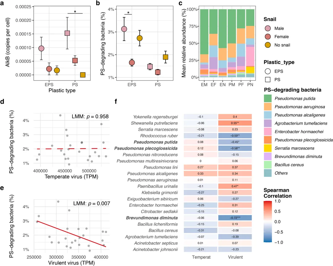 Figure 6:福寿螺消化对PS和EPS塑料圈PS降解潜力的影响。(a-b) 福寿螺消化对 (a) alkB基因和 (b) 潜在PS降解细菌相对丰度的影响 (n = 4)。(c) 潜在PS降解细菌群落的分类学组成 (n = 4)。(d-e) 塑料降解细菌的相对丰度与 (d) 温和型或 (e) 烈性型病毒的相关性。(f) 展示PS降解细菌与病毒之间相关性的热图 (n = 24)。