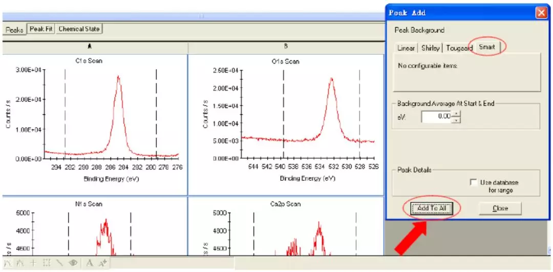b. 用鼠标+Ctrl键选中所有需要定量的元素窄扫谱图,然后进行加峰,即点击工具栏中 “Add Peak”图标。在弹出的窗口中选取“Peak Background”类型为 “Smart”,然后点击“Add To All”对所有元素进行定量加峰。