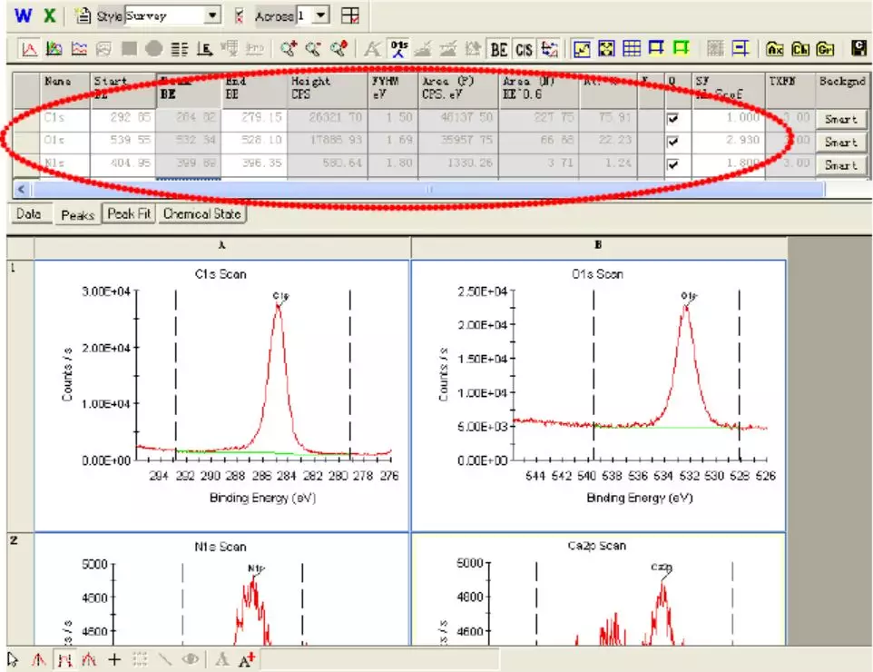 注:以上是应用Avantage软件中一些基本工具进行XPS谱图处理的相关步骤,若要使用软件中的其它特殊工具,如平滑工具“Smoothing”,去除脉冲工具“Manual Spike Editor”,谱图比对工具“Lightbox Compare”等对谱图进行特殊处理,具体操作方法可以参阅软件中的“Help”文件。