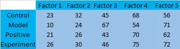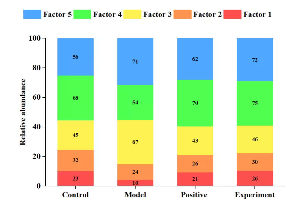 这里我准备了一组数据,分别是左侧的四个组别(正常对照组,模型组,阳性药组,实验组),每个组别分别测量5个指标(Factor 1,Factor 2, Factor 3, Factor 4, Factor 5)。我们想要显示出在每个组中,每个指标的相对丰度。