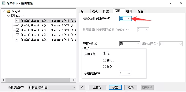2. 选中数据,选择百分比堆积柱状图。Origin里面提供了两个模板绘制百分比堆积柱状图(横向或者竖向),我们选择竖着的堆积柱状图。
