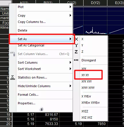 在book中导入多组数据后,我们一般要把每一列依次设置为X、Y、X、Y、……,此时,我们可以使用下面这个小技巧快速设置。