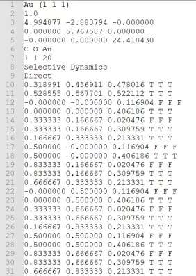 接下来可以准备POSCAR,把CO分子吸附在刚才的Au(111)面上,为了减小计算量小编在这里简单地把Au(111)的超胞缩小为2*2*1的了,并且固定了下面两层的Au原子,大家在实际计算中可以根据具体情况操作。