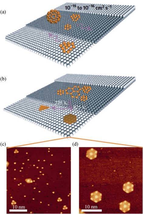 C60 开笼法是有效控制GQDs形状和尺寸的方法,通过控制退火温度和碳簇聚合的密度可制备三角形、平行四边形、梯形形状、六角形和蘑菇形的GQDs。如图6所示,退火温度为725K 时,GODs 呈三角形或六角蘑菇状和花朵状;在825 K 下退火时,小尺寸GQDs 聚合成为尺寸较大的六边形GQDs[8]。通过模板聚合、合成前预分离技术等也可实现对GQDs尺寸的调控。