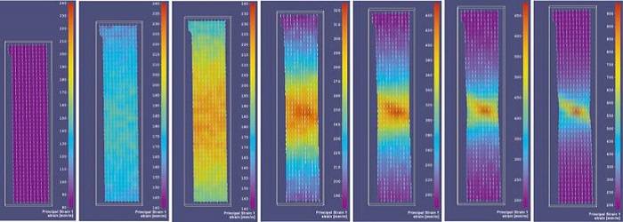 目前,DIC在材料研究方面应用最广泛也最成熟的就是通过DIC技术代替引伸计来测量样品在拉伸中的实时应变分步。对于传统的拉伸试验,要想获得实验过程中的应变数据,就需要在样品上装卡一个引伸计来得到应变的数据,它测量的是样品的平均应变,而DIC技术可以给出样品中点对点的应变信息,从而可以画出实验过程中的应变分布云图的变化过程,为分析研究材料的变形行为及失效断裂机理提供了良好的途径。图2就是一种双相钢板状样品在拉伸过程中不同时间的主应变的云图分布情况,图中颜色的深浅就代表着对应位置应变量的高低[3]。