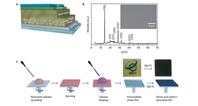 图8 电池的架构、钙钛矿层的XRD及溶剂设计过程